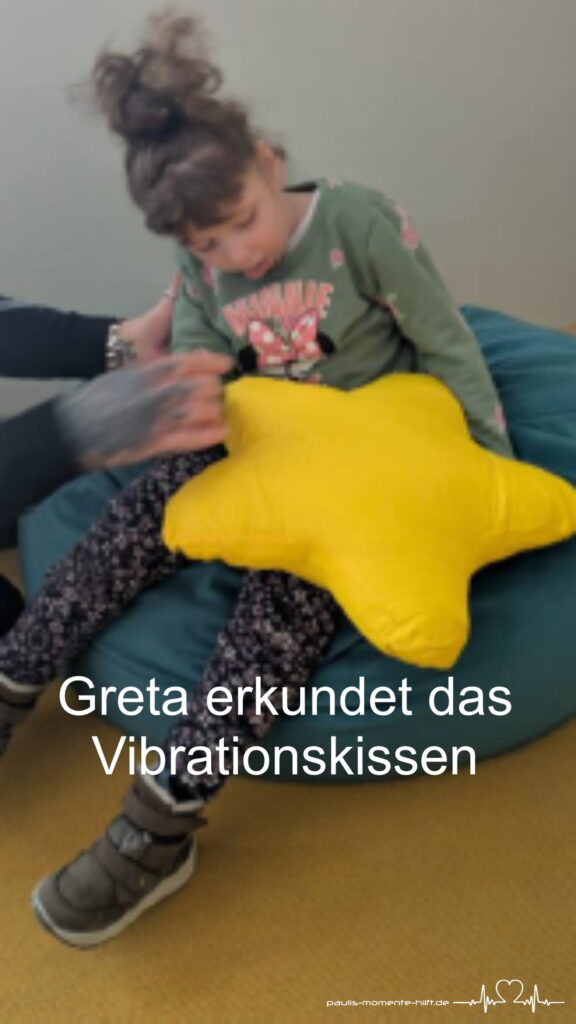 p.s.: Greta genießt die Zeit außerhalb ihres Rollstuhls sehr. Das Vibrationskissen erkundet sie aufmerksam und mit großer Neugier, und der Hund scheint zu einem treuen Freund für sie zu werden. Da Greta ihre Umwelt nur eingeschränkt visuell wahrnimmt, spielen andere Sinne für sie eine besonders wichtige Rolle.“