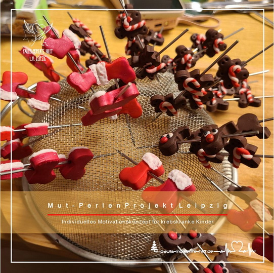Aus diesem Grund erhalten alle Mut-Perlenkinder, die Adventswochenenden und Weihnachtsfeiertage auf der Station verbringen müssen, eine Sonderperle in Form eines Elchkopfes, eines Lebkuchenmanns mit Zuckerstange und eines Nikolausstiefels.